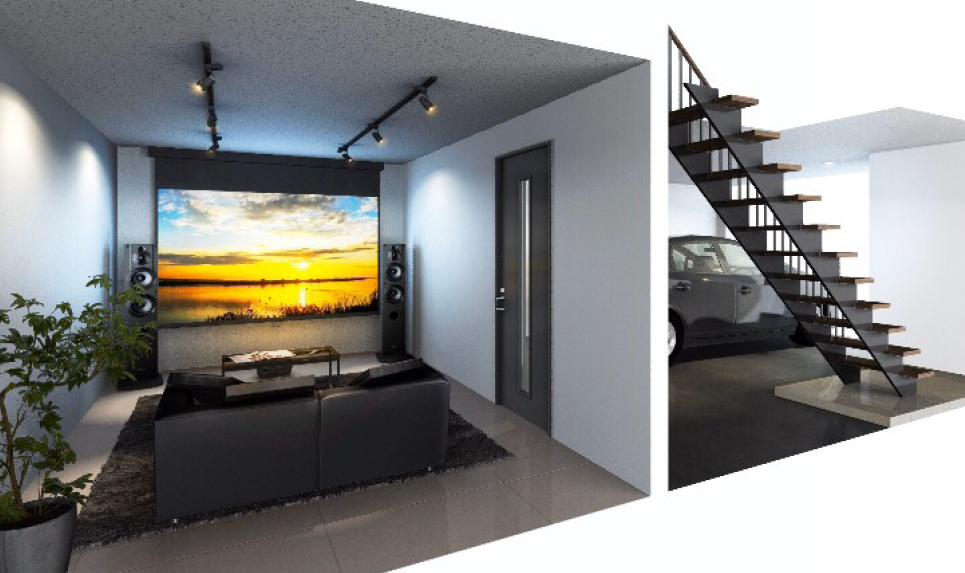 一階ガレージの奥の部屋が、防音室になっています。このガレージハウスが他とは違うメリットの一つです。写真のように、「マイスタジオ」、「ピアノ教室」、「YouTubeスタジオ」と、ご近所への騒音を気にする事なく、思いっきり、趣味やお仕事ができる特別な空間になります。